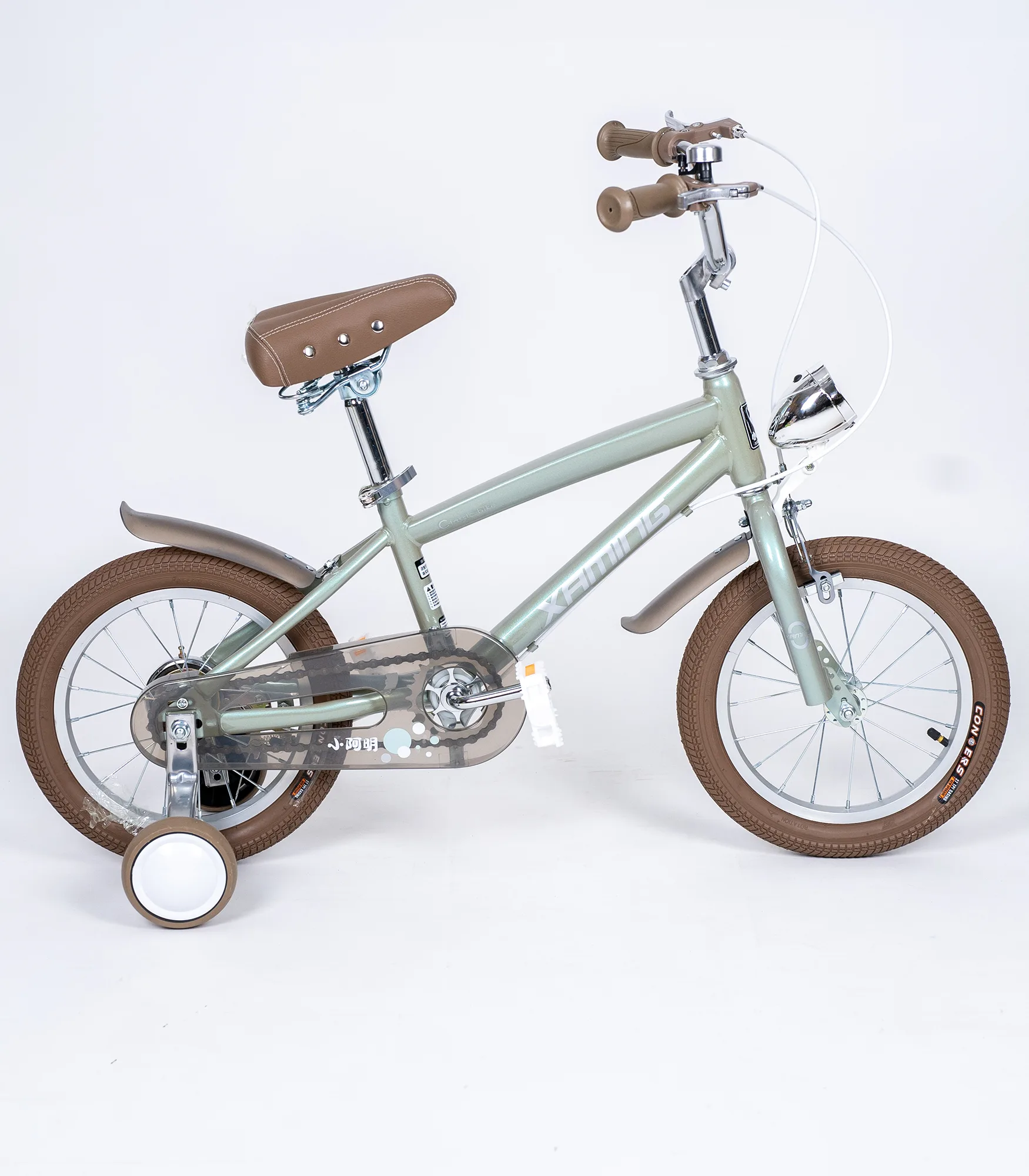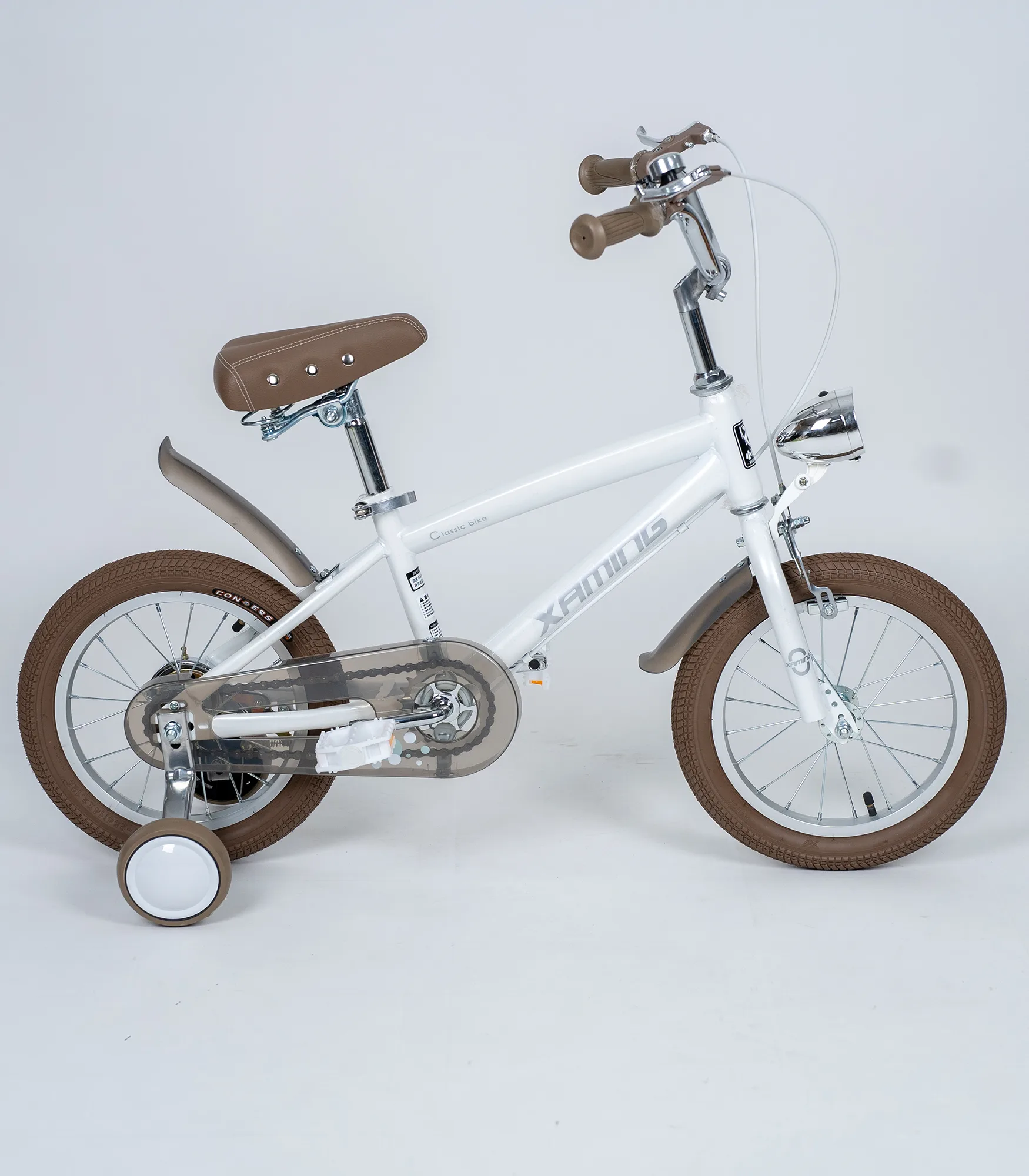 Bicikl je opremljen pomoćnim točkićima koji pružaju dodatnu stabilnost, a po potrebi se kasnije mogu skinuti. Tu je i prednje svetlo, kao i blatobrani (prednji i zadnji) za čistiju vožnju. Zaštita lanca (chain guard) štiti odeću i povećava bezbednost tokom pedalanja, dok udobno sedište i ručke doprinose prijatnoj vožnji u dvorištu, parku ili na šetalištu.
