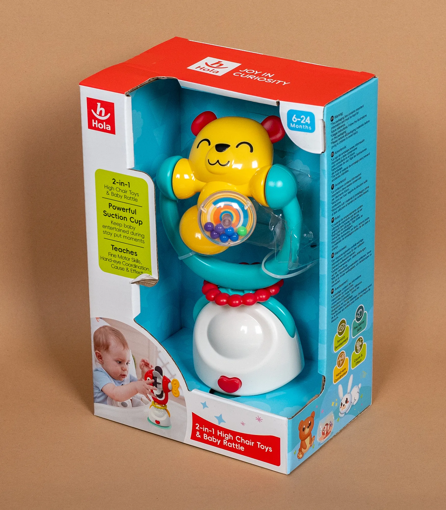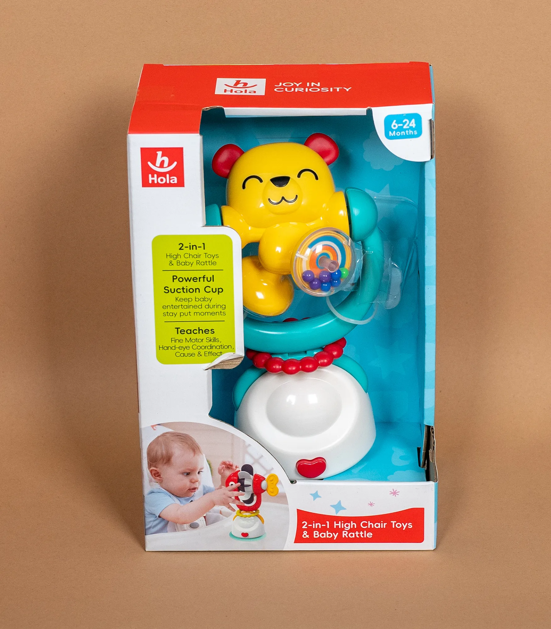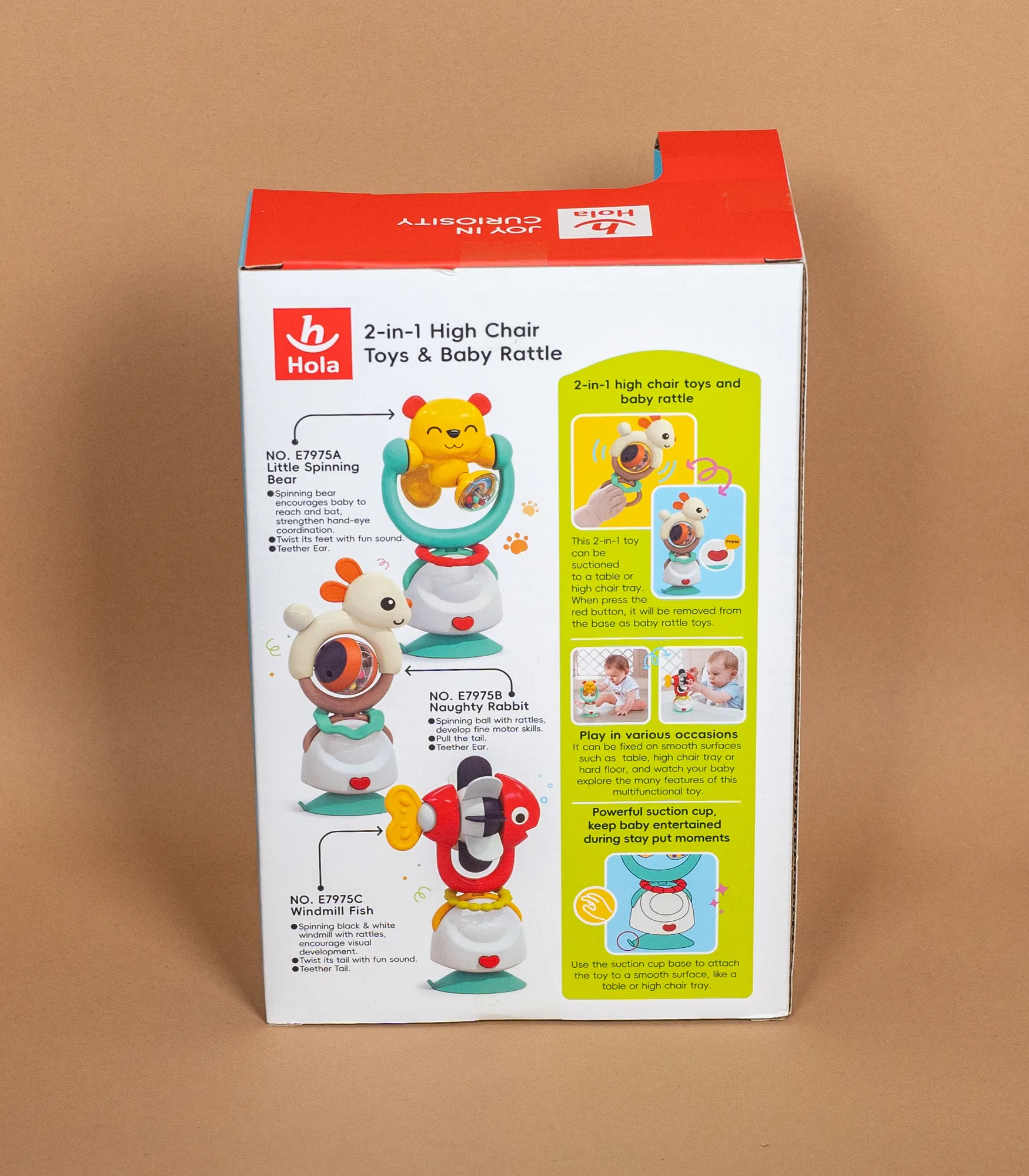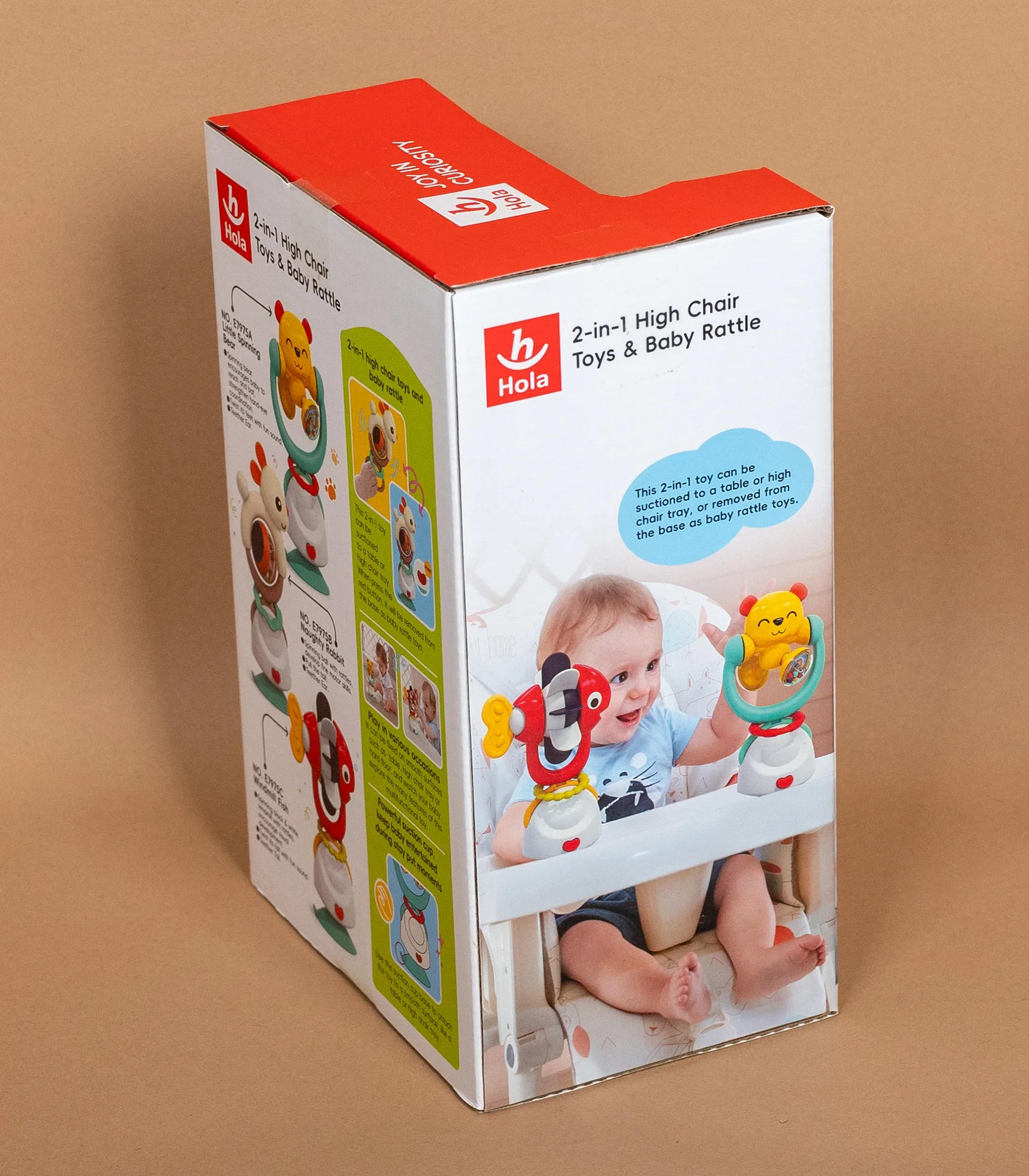 E7975A je praktična 2u1 igračka za hranilicu i bebi zvečka, osmišljena da zabavi bebu tokom obroka i podstakne razvoj motorike. Igračka ima vakum (suction) bazu za stabilno pričvršćivanje na tacnu hranilice, sto ili druge glatke površine, pa ostaje na mestu i ne kliza dok se dete igra.