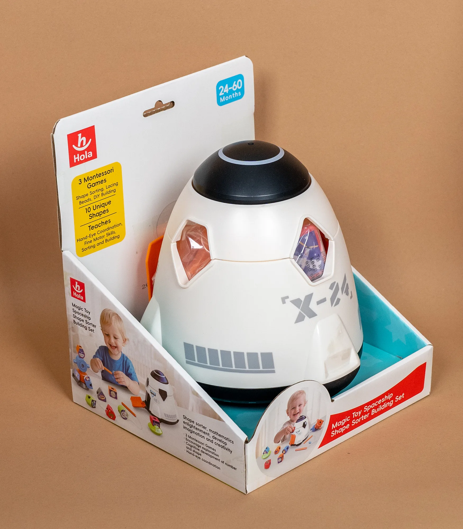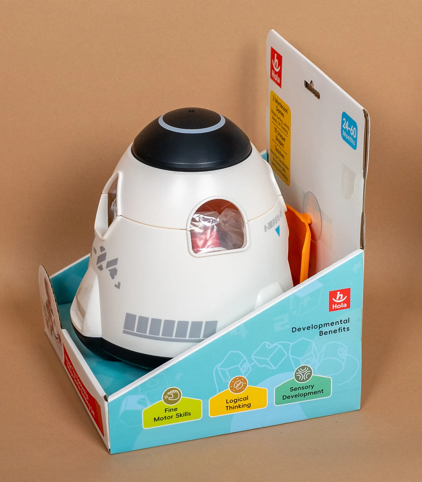 Model HE792000 je Montessori edukativna igračka u obliku svemirskog broda, namenjena deci uzrasta 24–60 meseci (2–5 godina). Set kombinuje učenje i igru kroz 3 Montessori aktivnosti koje podstiču koncentraciju, logičko razmišljanje i razvoj motorike.