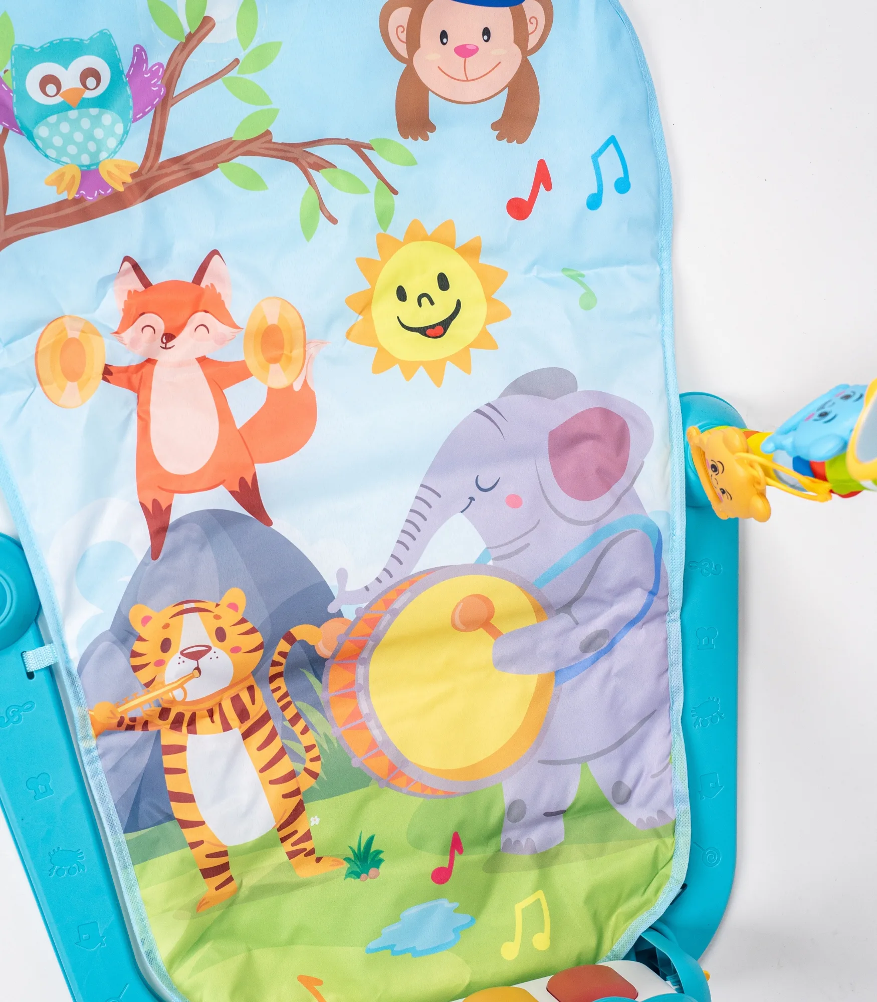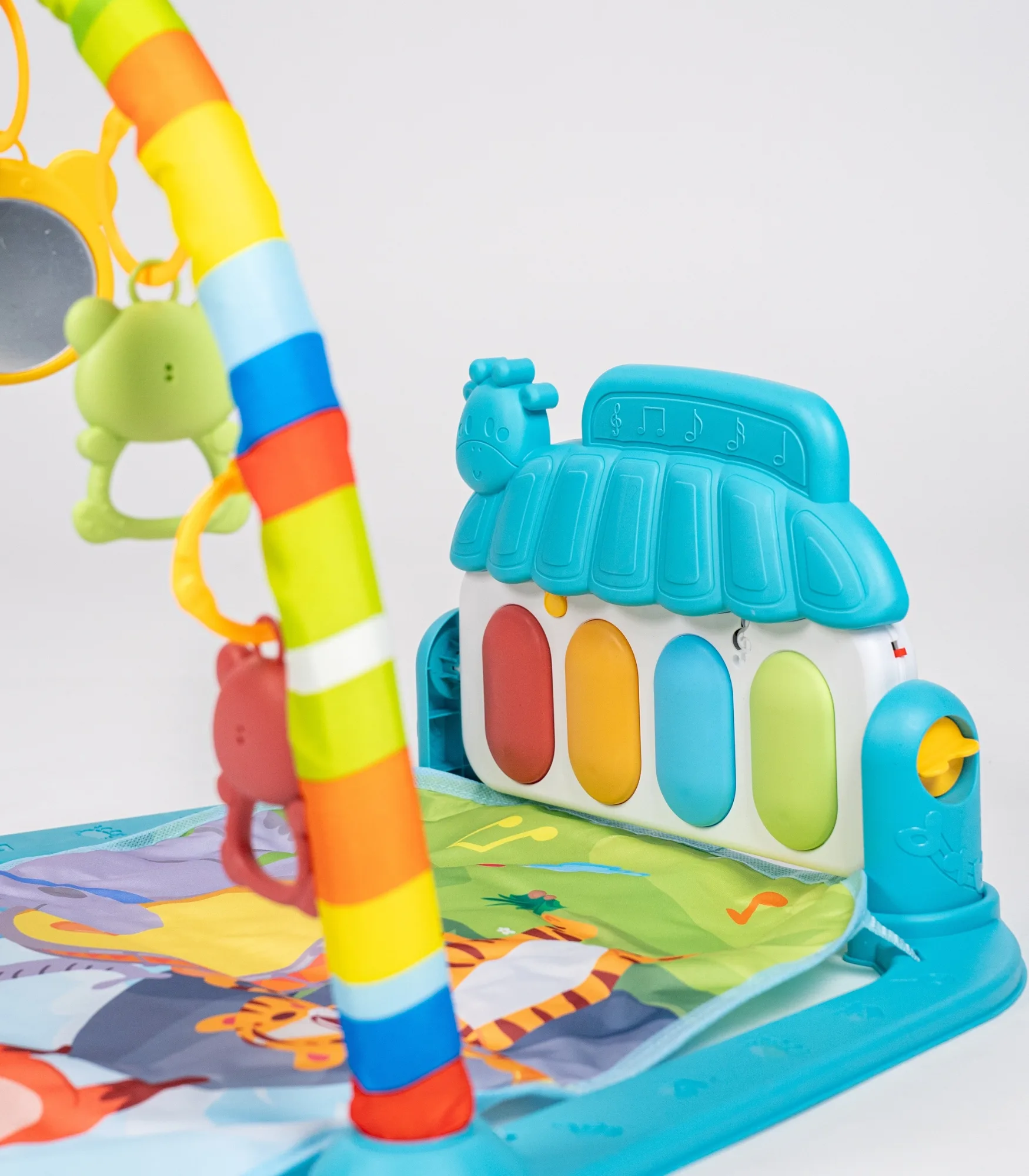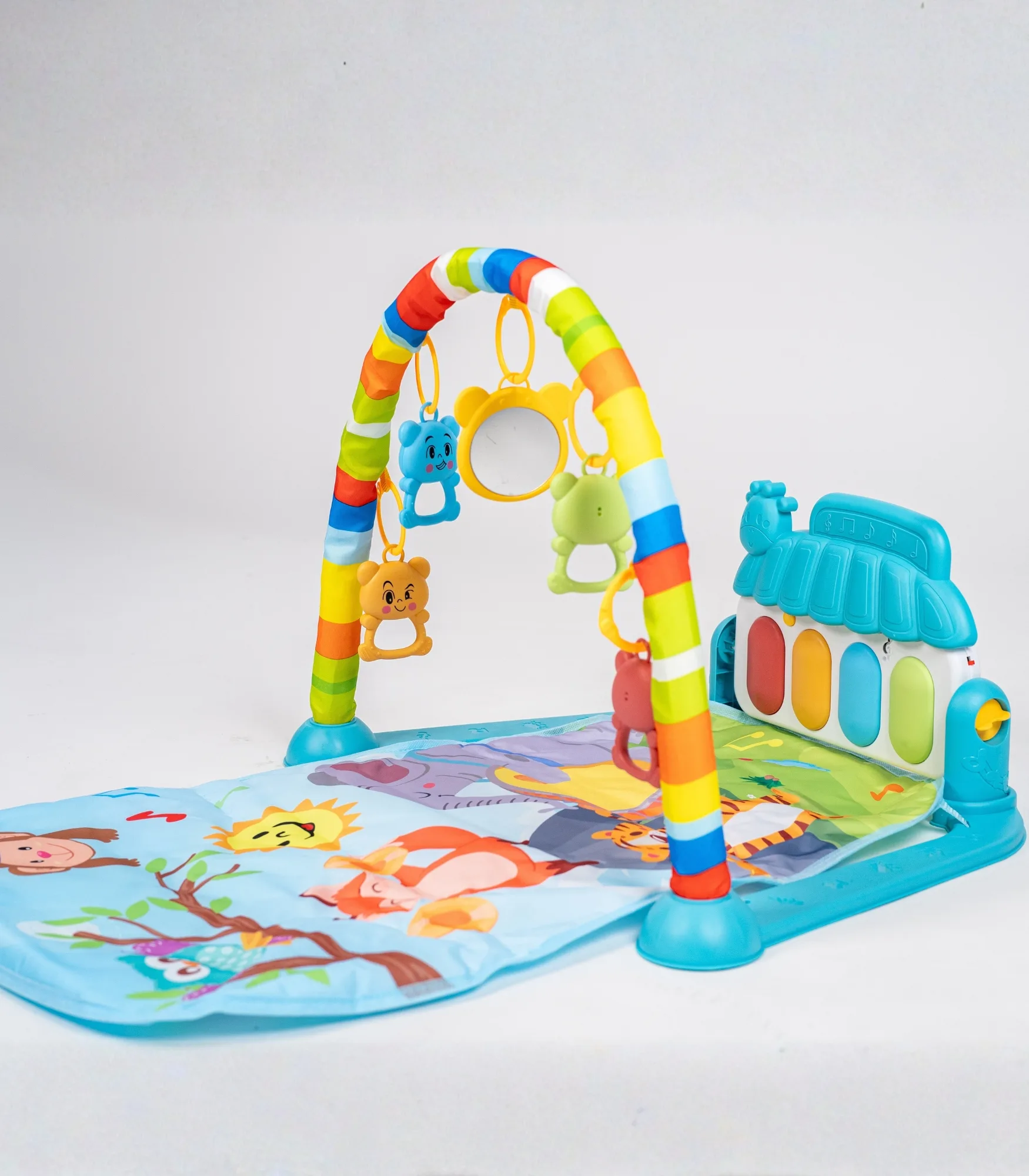 Muzička podloga za bebe 518A-28 sa lukom i visećim igračkicama + muzički piano panel (radi na baterije). Idealna za igru i stimulaciju čula od prvih dana.