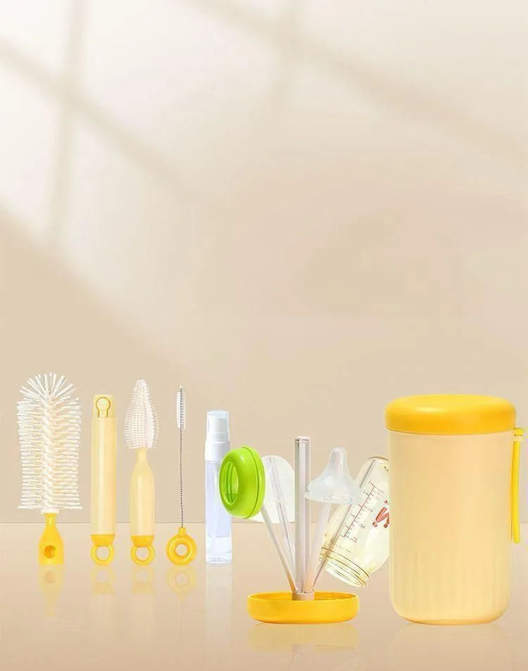 Praktičan set za čišćenje flašica i cucli, spakovan u kompaktnu kutiju koja služi kao organizator i čuva sve dodatke na jednom mestu. Namenjen je roditeljima koji žele brzo i higijensko rešenje – bilo kod kuće, bilo kada ste u pokretu.